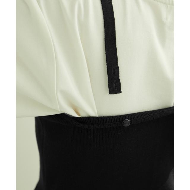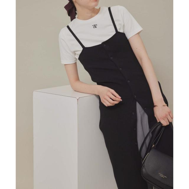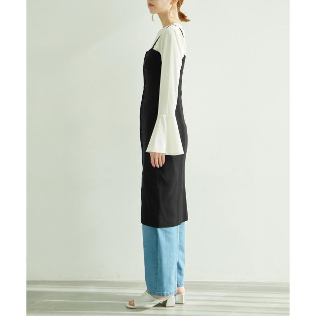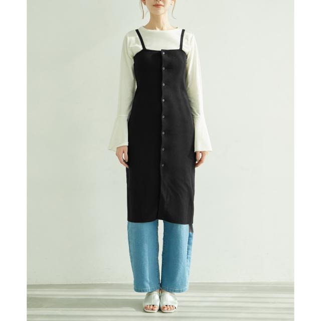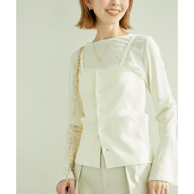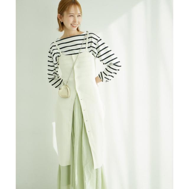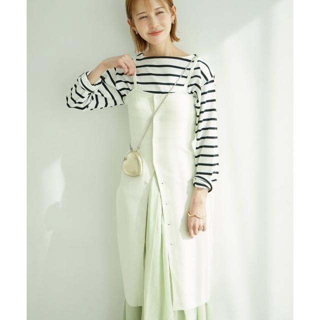 ・肩紐のボタンが外せるので、ベアトップ風の着こなしも楽しめる。