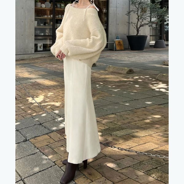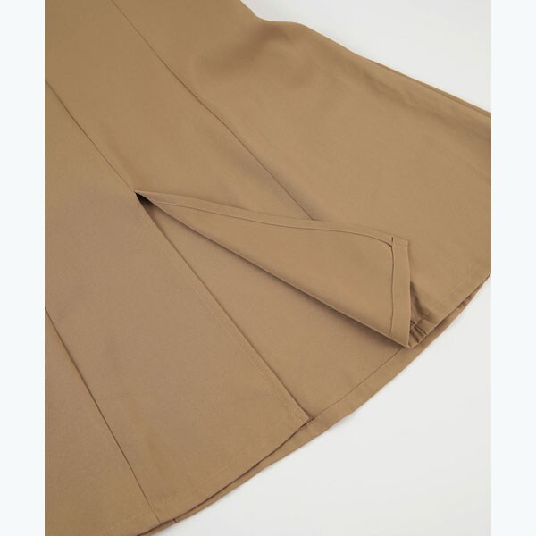 ・裾のマーメイドシルエットで脚長効果が期待でき、腰位置を高く見せてくれるデザイン。