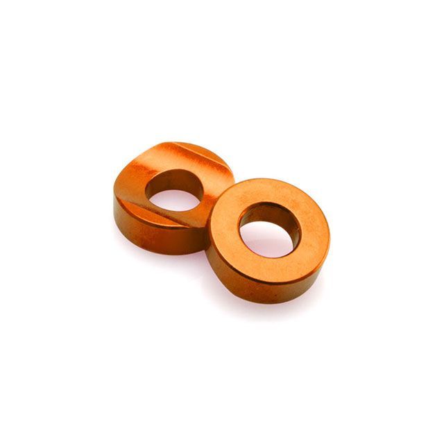 リムの曲面に合わせたビートストッパー専用スペーサー。標準のスプリングワッシャーに比べ面に固定するため確実な締め付けが可能。