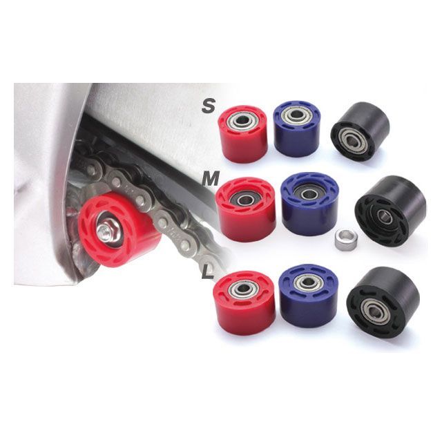 ベアリングを内蔵したチェーンローラー。チェーンの暴れやタルミを抑え、チェーンのスムーズな動きをサポート。直径が32mmのSサイズ、42mmのLサイズ、そしてCRFやKXF等にも使用できる直径36mmのMサイズの計3タイプを設定。 内径8mm。