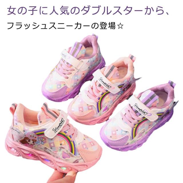 | 女の子に人気のダブルスターから、フラッシュスニーカーの登場☆ 跳んで走って、サイドのラインをキラキラさせちゃおう♪ レインボーカラー使いで、華やかな足元に。 お外に出るのが、楽しみになりますね。 かわいい〜が大スキなお子さまにどうぞ。 | |