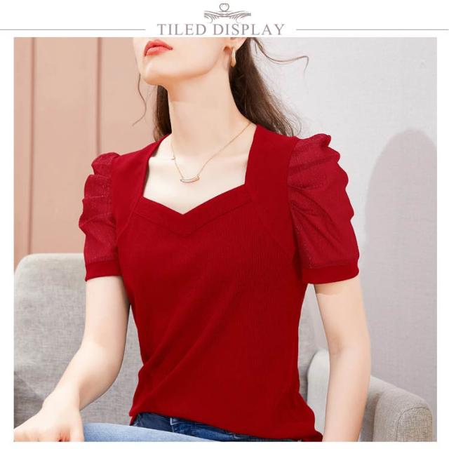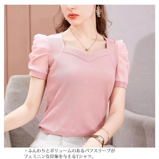 レディース きれいめ Tシャツ 無地 Tシャツ パフスリーブtシャツ 半袖 バルーン袖 オフィスカジュアル トップス 通勤 通学 シースルー袖 おしゃれ 大人可愛い 大きいサイズ