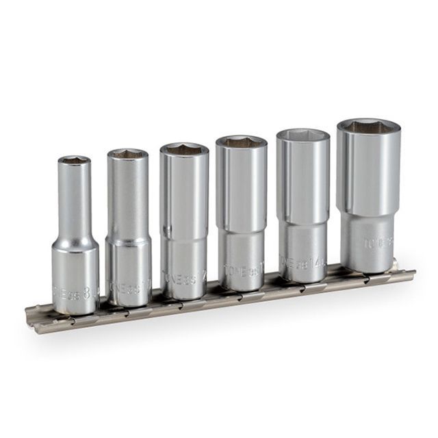 ディープソケットで奥まった箇所のボルトや、ボルトが突き出したナットを回すのに最適なソケットセット。対辺6角形状。差込角9.5mm。