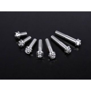チタン合金 Ti-6AL-4Vを総削り出し加工したフランジ六角ボルト。ボルト頭部はモーターサイクル用に一般規格よりもワンサイズ小さく設計することで、さらなる軽量化を実現。M7以上はワイヤーロック用の穴あき加工を施す。