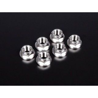 フランジ付ロックナットのセット。高強度チタンを使用するため、6角の2面幅をワンサイズ小さくすることが可能で、さらなる軽量化を実現。YZF-R1の純正と比較した場合、純正ナットが1個あたり約14gに対して、ZETA製品は約5g。合計6個使用するため、その差は実に54gになる。