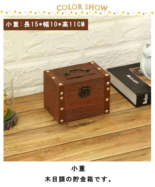 | 木目調の貯金箱です。 硬貨はもちろん紙幣を折らずに投入できます。 アンティーク風デザイン、お部屋のインテリアにも合わせやすい。 持ち手が付いているので、持ち運びがしやすい。 錠付きなので、大切なお金をしっかりと保管できます。 | |
