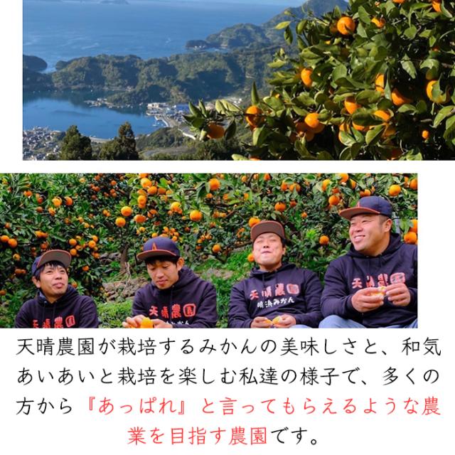 天晴農園が栽培するみかんの美味しさと和気あいあいと栽培を楽しむ個性豊かな生産者さんの様子で、多くの方から『あっぱれ』と言ってもらえるような農業を目指す農園です。これまでにみかんを通して出会った方を大切に、これからみかんを通して出会えることを楽しみにみかん栽培をしています。