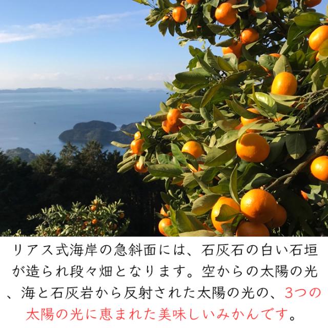 明浜町は宇和海に面しており、一年を通じて雨が少なく温暖な気候です。複雑なリアス式海岸沿いの急斜面には、人の手で丁寧に積み重ねられた石灰石の白い石垣が造られ、そこに段々畑が形成されています。一年を通じて降り注ぐ空からの太陽の光、海から反射された海の太陽の光、石灰岩から反射された石積みの太陽の光の3つの太陽に恵まれ、みかんを美味しく育ててくれます。