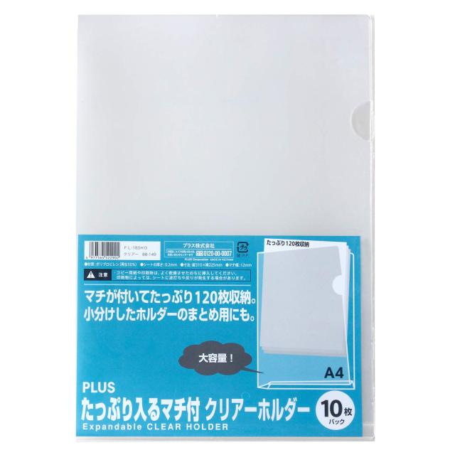 プラス クリアホルダー A4 たっぷり入るマチ付 10枚 FL-183HO 88-149