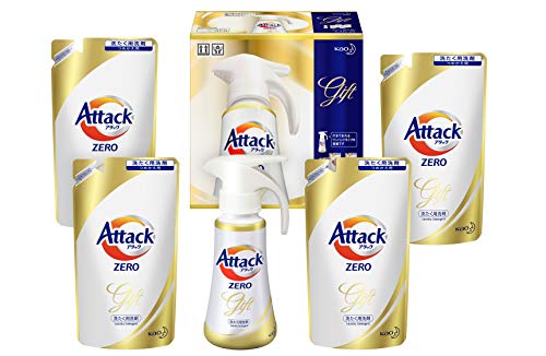 暮らしに役立つ贈りもの。液体洗剤アタックZEROの本体とつめかえのセットです。 セット内容量: アタックZEROワンハンドプッシュ本体400g*1本、つめかえ用360g*4袋