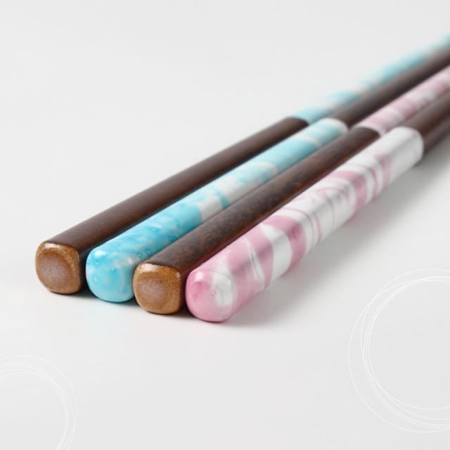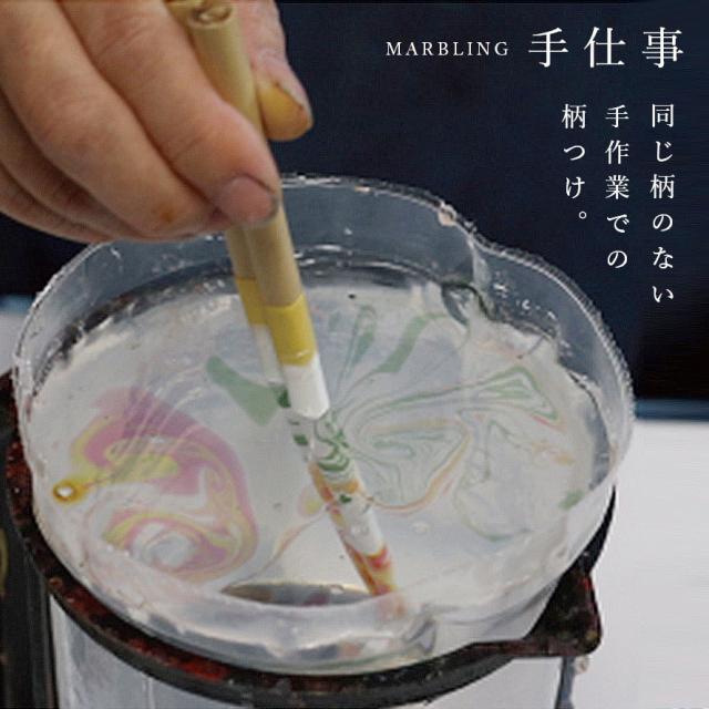 絵画技法の「マーブリング技法」によって模様をつけ、一膳一膳同じ柄のないお箸、「いちごいちえ」水面シリーズ。広がる水面のような、みずみずしい美しい仕上がり。