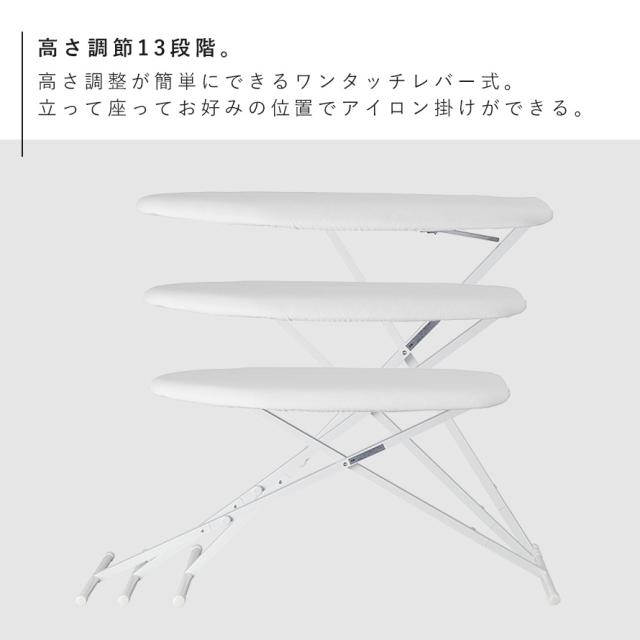13段階の高さ調節機能付きだから、立って座って、お好みの姿勢でアイロン掛けができます。