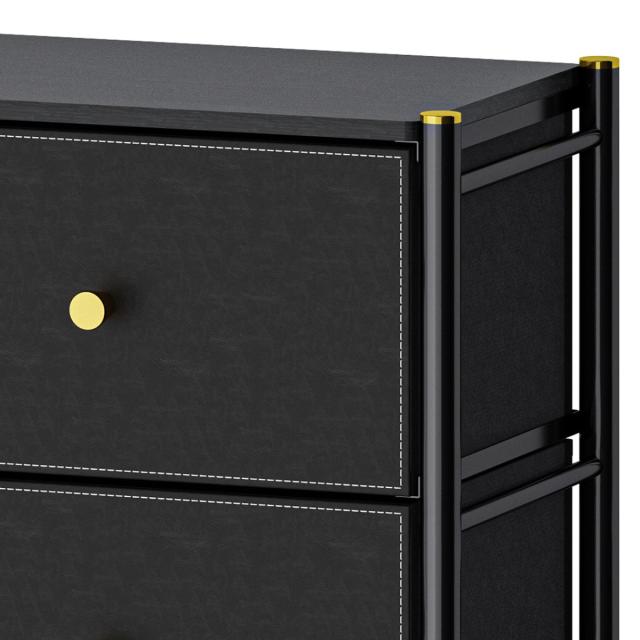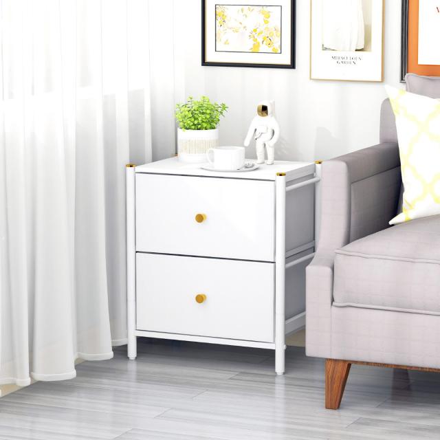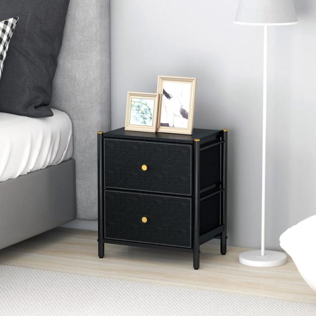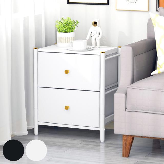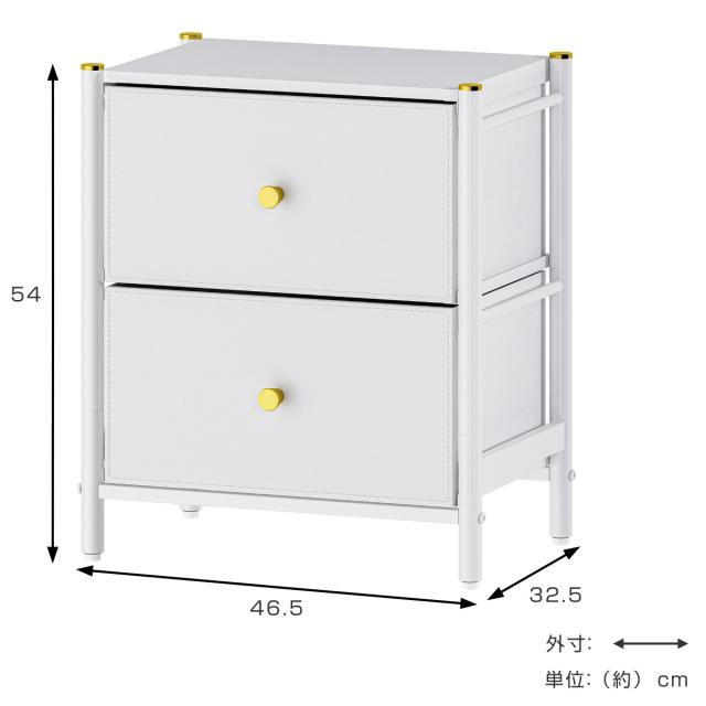 スチールのフレームとフェイクレザーの引き出しを組み合わせたエレガントな2段チェストです。お部屋のインテリア性を高め、落ち着いた雰囲気を演出します。