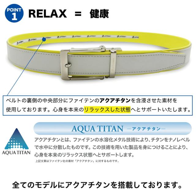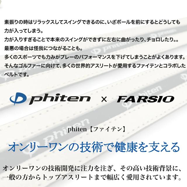 ベルト本体の裏面にファイテンの技術のアクアチタンを含浸したphitenテープを縫い付けてあり、装着するだけで人間本来のリラックス効果を生み、緊張緩和や精神バランスの調和、さまざまな不調改善など安定したパフォーマンス発揮をサポートいたします。ゴルフの時はリラックスした快適なゴルフウィングを!さらに常時ご着用いただくことでより効果を発揮しますので、普段から身につけて頂きやすいデザインで尚且つ高品質にこだわった商品にいたしました。