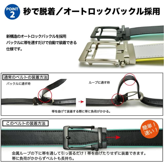 また秒で脱着できる新構造の簡単オートロックバックルを採用しており、締める緩めるの微調整も簡単。ストッパー部分は樹脂で穴からベルトが傷んでくることもありません。ウエストサイズ最大約120cmまで対応したロングサイズでカットして短くすることも可能です。