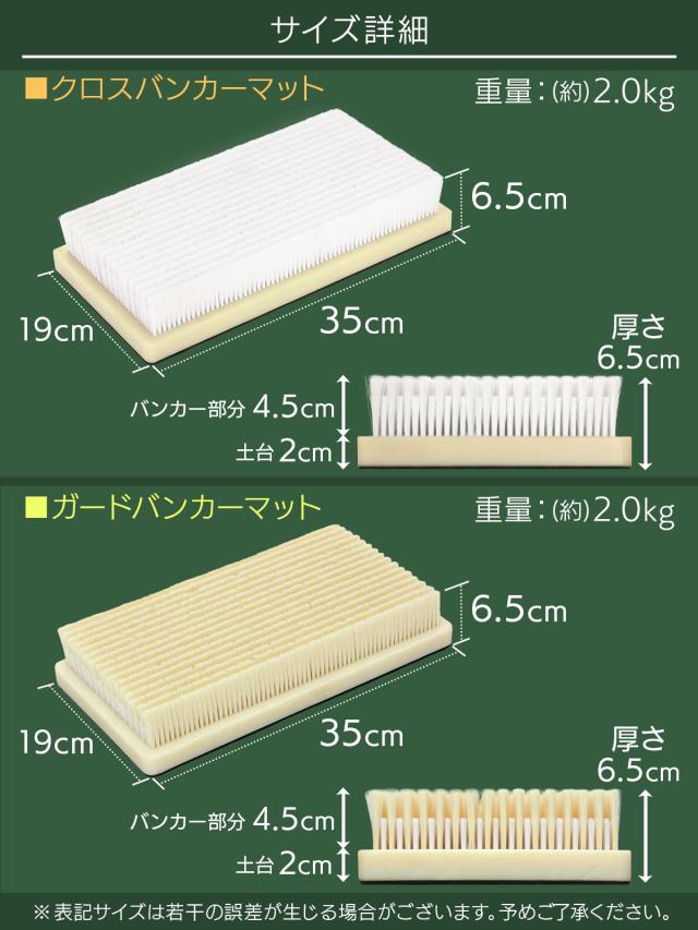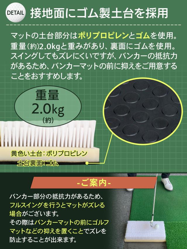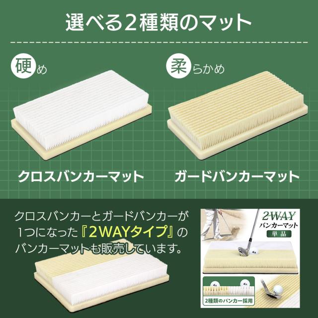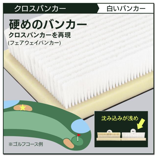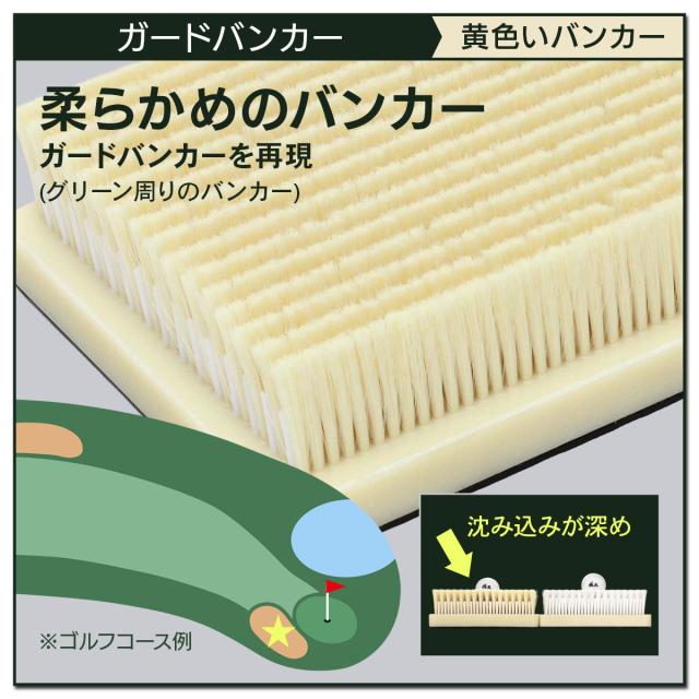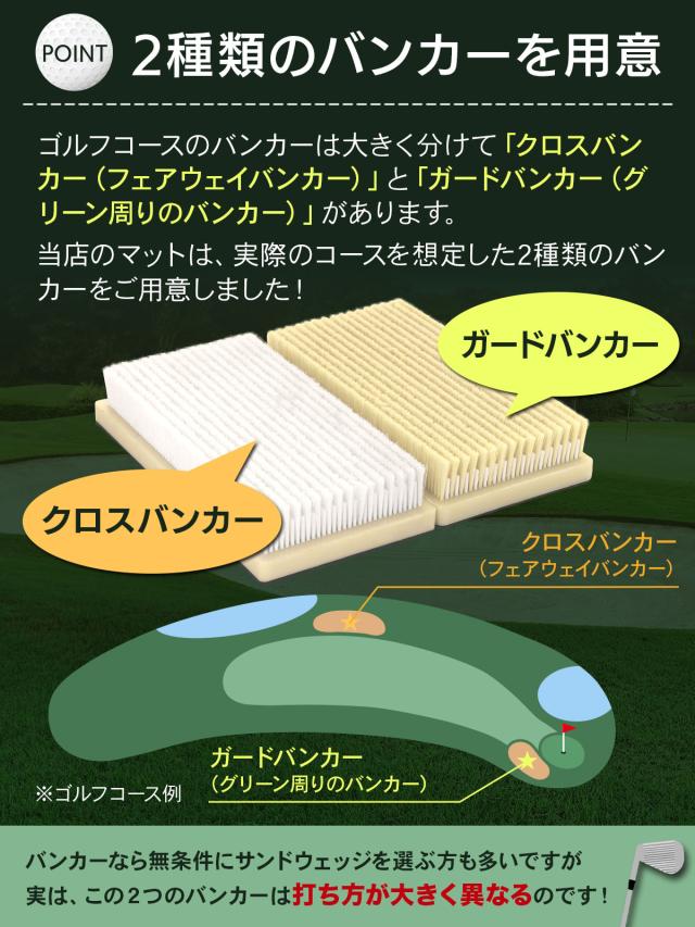 【実際のコースを想定した2種類のバンカーを用意】バンカーには大きく分けて「クロスバンカー(フェアウェイバンカー)」と「ガードバンカー(グリーン周りのバンカー)」があり、更に実際のバンカーは砂の量、天気などで様々なシチュエーションがあります。当店のバンカーマットで特徴と打ち方を覚えておけば、経験を重ねていくことで応用が利くようになっていきます。