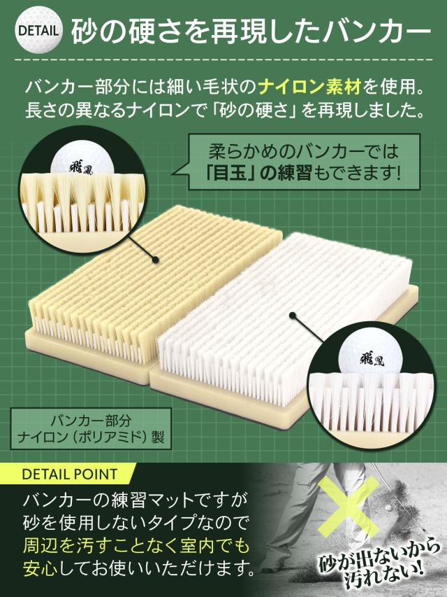 フェアウェイバンカーとグリーン周りのバンカーを再現したバンカーマットの登場!特徴や打ち方を覚えることで、実際のバンカーへの応用も利くようになっていきます。