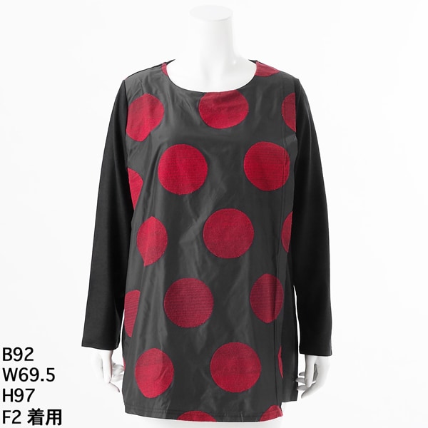 大きなドットのジャガードがインパクトのあるシャカシャカのマイクロタフタと伸びやかなポンチ素材切り替えのおしゃれチュニックです。