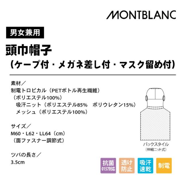住商モンブラン 衛生帽子 9-1011 9-1012 9-1013 9-1014 顔まわりのサイズ調節がしやすい面ファスナータイプ。 ケープ付 メガネ差し付 マスク留め付
