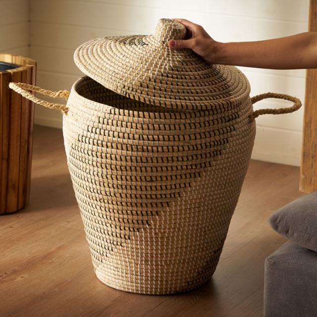 バスケット ふた付き 持ち手付 かごバスケット シーグラス 約 W 44cm D 44cm H 60cm ナチュラル ブラック 収納 51354