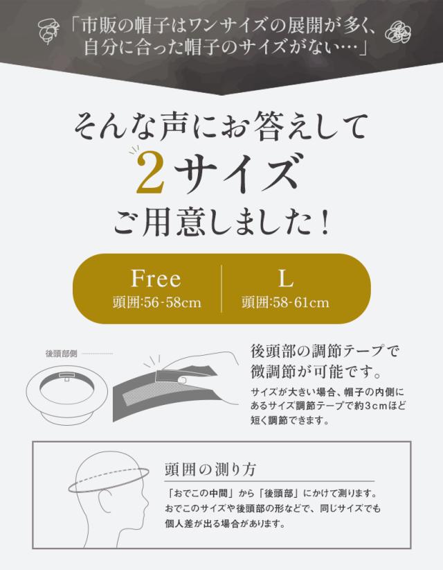 | ・高さはモデル着用時の高さを記載しています。 ・頭囲・高さ・つばのサイズ表記は、5ミリ前後の誤差が生じる場合があります。計測サイズは目安としてお考えください。 ・お取り扱いの前に品質ネームタグの記載をご確認ください。 ・ご覧頂くモニターの発色具合によって実物と色が異なって見える場合があります。 ・単品商品の撮影画像が実際の商品と色合いが近くなっていますので、ご参照ください。 ・同商品でも、染色過程で色味が多少変わる場合があります。 ・マジックテープでのサイズ調整可能 |