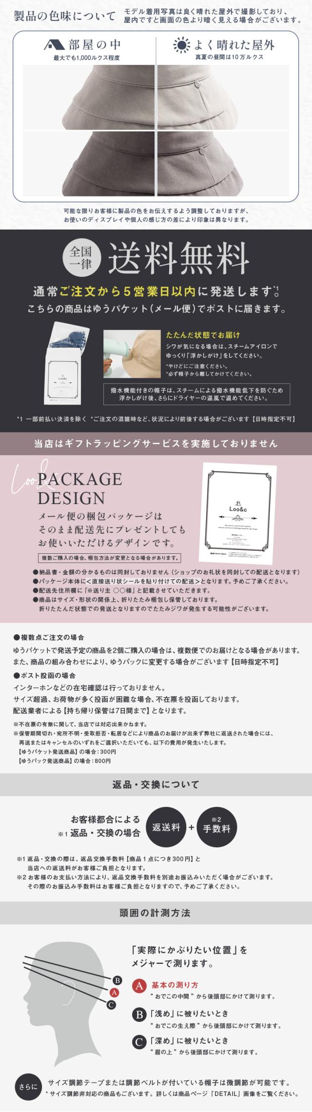 | ・高さはモデル着用時の高さを記載しています。 ・頭囲・高さ・つばのサイズ表記は、5mm前後の誤差が生じる場合があります。計測サイズは目安としてお考えください。 ・お取り扱いの前に品質ネームタグの記載内容をご確認ください。 ・ご覧いただくモニターの発色具合によって実物と色が異なって見える場合があります。 ・商品単体の画像が実際の商品と色合いが近いものとなっておりますので、ご参照ください。 ・同商品でも、染色過程で色味が多少変わる場合があります。 ・後頭部のサイズ調節テープで微調節が可能です。 |