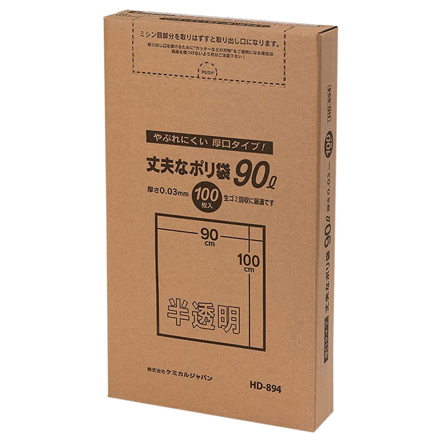 商品名 丈夫なポリ袋 半透明 90L HD-894 100枚 ごみ袋 容量 100枚 成分 HD (高密度ポリエチレン) 生産国 ベトナム ※ こちらの商品は国内正規品となります。 使用方法 収納に便利なボックスタイプ引き出しや棚など収納スペースにあわせて、立て掛けたり置いたり隙間に入れたりしてお使いください。 JANコード 4991437150702