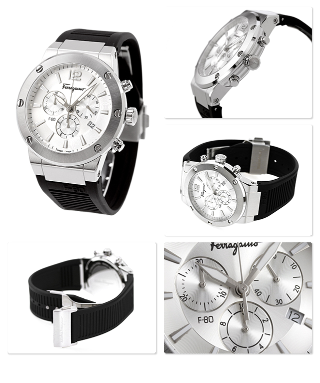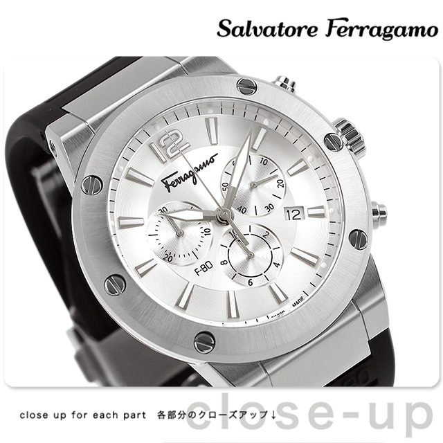 7年保証キャンペーン サルヴァトーレ フェラガモ エフエイティ クロノグラフ スイス製 メンズ 腕時計 SFEX00623 Salvatore Ferragamo F-80 アナログ シルバー ブラック 黒 ◆創業者の名を冠したサルヴァトーレ フェラガモは、靴の専門店でした。美しいデザイン、優れた技術、履き心地の良さで世界中にその名を轟かせ、現在ではトータルファッションブランドとして知られています。フェラガモウォッチは提携工場での組み立てを行っており、スイス製のムーブメントを用いています。伝統的なイタリアのクラフトマンシップを随所に生かし、シンプルながらも洗練された個性を感じさせるデザインが魅力です。 スポーティさと、ラグジュアリーさを併せ持つデザインが男らしい腕元を演出。日付表示やクロノグラフ機能を搭載。ビジネスシーンでも活躍します。