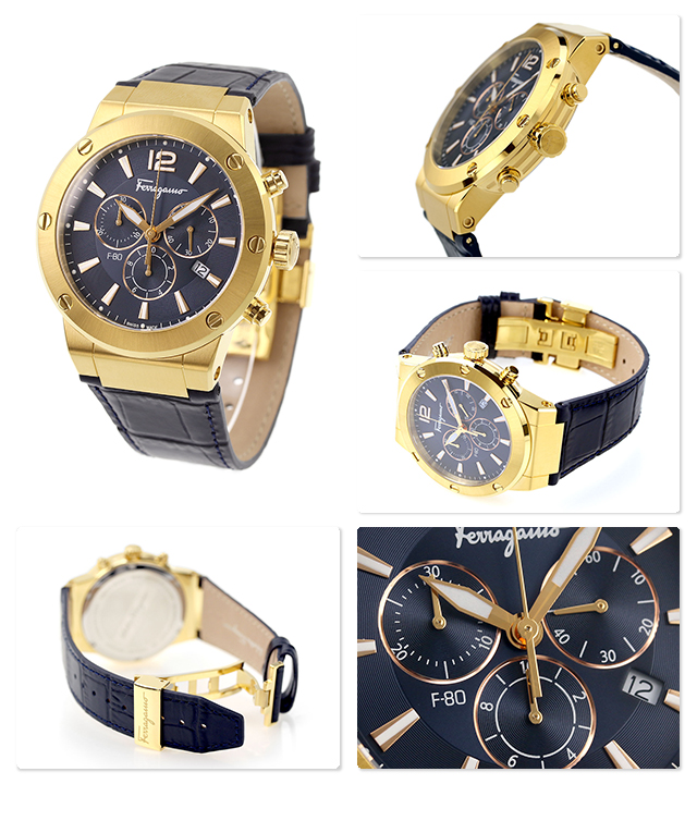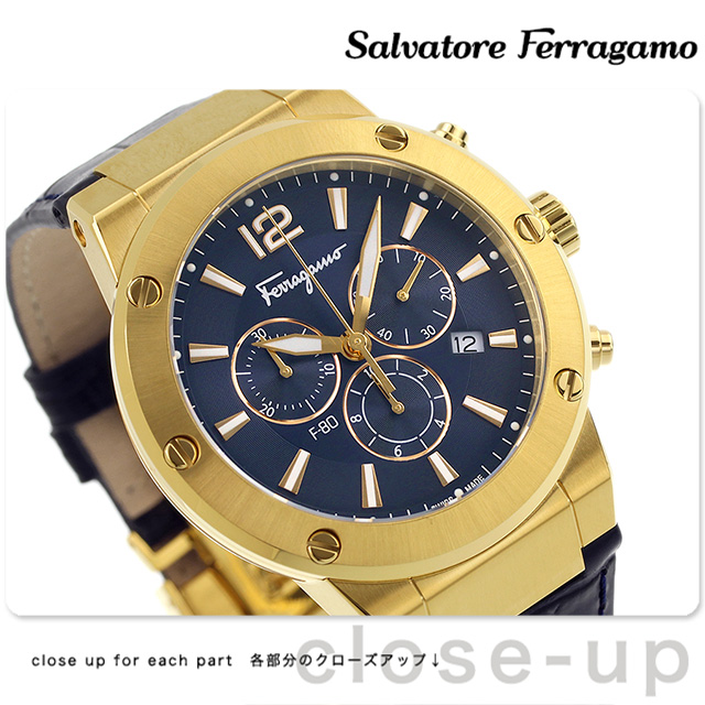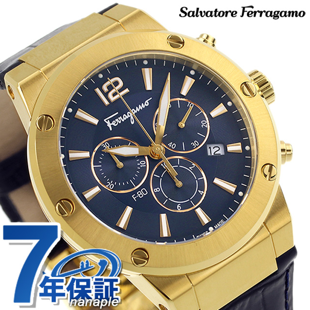 7年保証キャンペーン サルヴァトーレ フェラガモ エフエイティ クロノグラフ スイス製 メンズ 腕時計 SFEX00723 Salvatore Ferragamo F-80 アナログ ネイビー ◆創業者の名を冠したサルヴァトーレ フェラガモは、靴の専門店でした。美しいデザイン、優れた技術、履き心地の良さで世界中にその名を轟かせ、現在ではトータルファッションブランドとして知られています。フェラガモウォッチは提携工場での組み立てを行っており、スイス製のムーブメントを用いています。伝統的なイタリアのクラフトマンシップを随所に生かし、シンプルながらも洗練された個性を感じさせるデザインが魅力です。 スポーティさと、ラグジュアリーさを併せ持つデザインが男らしい腕元を演出。日付表示やクロノグラフ機能を搭載。ビジネスシーンでも活躍します。