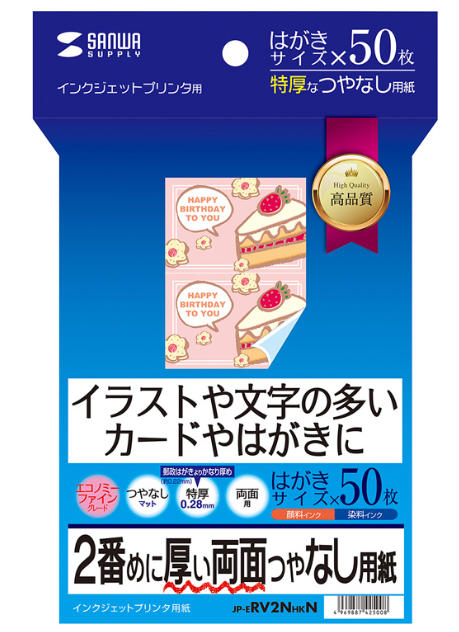 【ポスト投函で送料無料】サンワサプライ インクジェット両面印刷紙 特厚 はがきサイズ 50枚入り JP-ERV2NHKN 両面つやなし イラストや文字の多いカードやはがきに