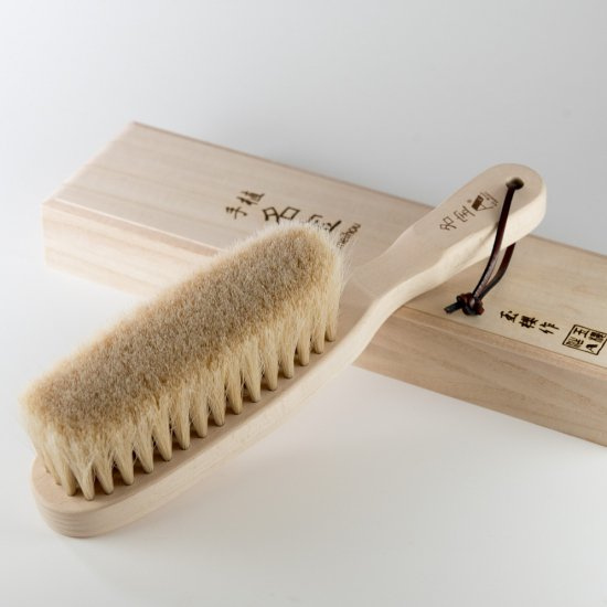 伝え守りし、手植えの技を施した芸術の一品。カシミヤにも使える柔らかさとブラッシングに必要なコシを兼ね備えた希少な馬毛を100%使用。上質な白馬の尾毛を、約29400本使用し、毛の長さも45mmと長くしております。父より子へ、ブラシ職人の技が宿る手植えブラシです。国内でも限られたメーカーでしか加工できないとされる「毛の先付け加工」と、「ラウンドカット加工」を施してあります。もはや芸術の域に達したと言っても過言ではない至極の一品です。力を入れずに優しくブラッシングすることで、繊維の奥に入り込んだホコリも素早く払い落とし、衣類の毛並みを整えます。カシミヤ、ウール、ツイード、モヘア、毛皮など衣類全般に幅広くお使いいただけます。