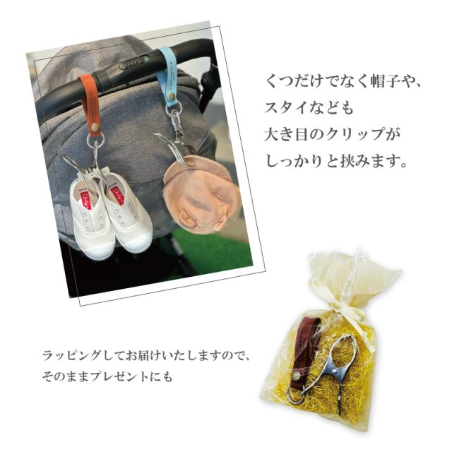 名入れ刻印 レザーのシューズクリップ 本革 牛革 プレゼント ギフト 出産祝い 記念 名前入り ベビーカー ベビーカークリップ ママ シューズホルダー シューズピンチ ブランケットクリップ ベビーカークリップ ベビーカーフック 便利グッズ お出かけ お祝い