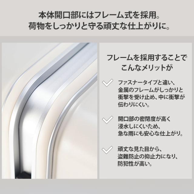| たっぷり入って軽い、が自慢の「デカかるEdge」のフレームタイプ。 軽量だけでなく、強度を誇るボディ素材はポリカーボネイト100%。静音性に優れた新素材採用のLisof®? Silent Runを搭載。ダブルホイールキャスターが抜群の安定性と走行性を誇ります。 揺れる電車や坂道で便利なストッパー機能を搭載、そのうえ、前輪だけが止まるので、トローリーハンドルを引いて本体を斜めに倒せばストッパーを解除することなく移動ができます。 特殊コーティングされたポーカーボネイト製コーナパッドは、本体と同色でドレスアップ!! |