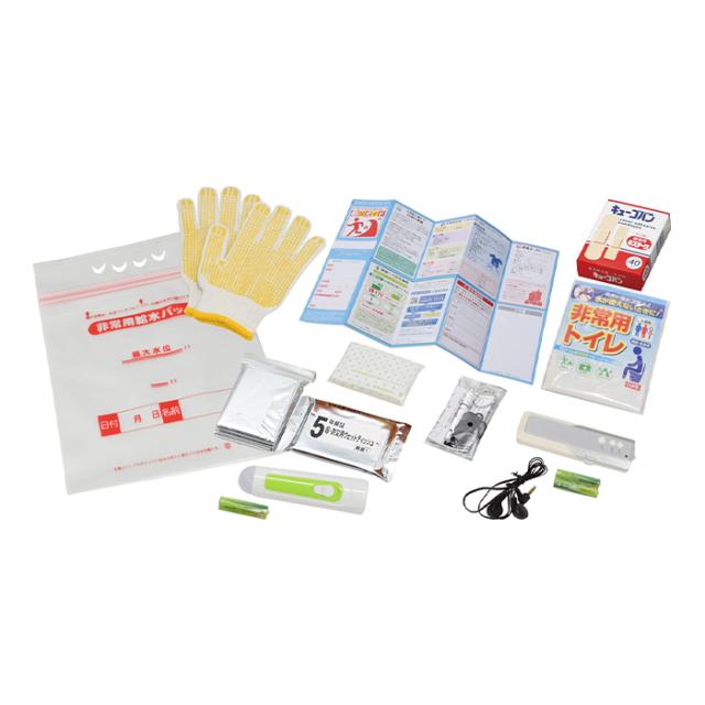 | ●リュック ●コンパクトFMラジオ ●単4マンガン電池×2本 ●2WAYぴかりんライト ●単3マンガン電池×1本 ●非常用給水バッグ5L ●防災用ウエットティッシュ ●防寒シート ●ホイッスル ●すべり止め手袋 ●非常用トイレ ●ポケットティッシュ ●救急絆創膏2サイズ40枚入 ●防災ガイド |