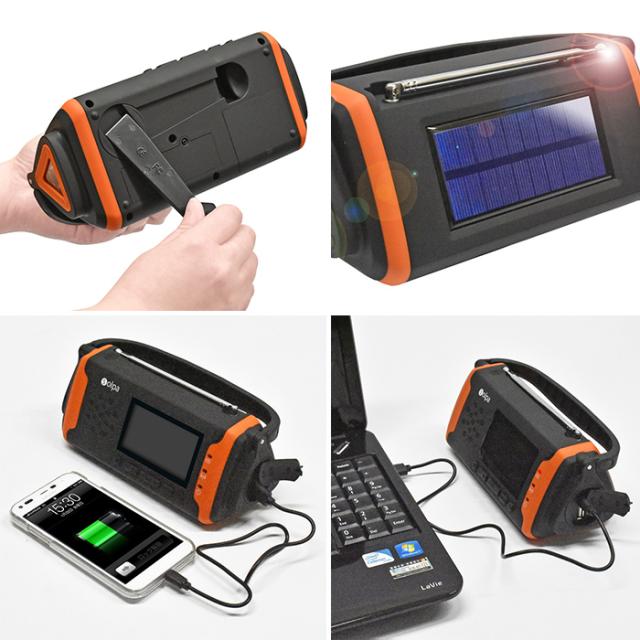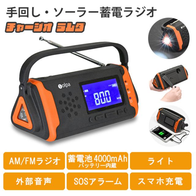 キーワード: 蓄電ラジオ 手回し充電 手廻し ソーラー充電 USB充電 3電源 ラジオ AM FM ライト 蓄電池 4000mAh バッテリー内蔵 外部音声 SOSアラーム スマホ充電 USBケーブル付き チャージオラムダ 緊急 非常時 避難 災害 震災 水害 停電 夜間 万が一の備え 屋外 レジャー キャンプ アウトドア 手回し・ソーラー蓄電ラジオ チャージオラムダ