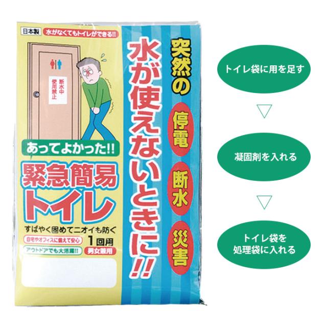 キーワード: 簡易トイレ トイレセット 1回分 1回用 大小兼用 非常トイレ 携帯用トイレ 緊急トイレ 非常用トイレ 汚物 排泄物 凝固 消臭 凝固剤 トイレ袋 処理袋 備蓄 緊急 非常時 避難 災害 震災 水害 万が一の備え 渋滞 レジャー キャンプ アウトドア 緊急簡易トイレ 1回用