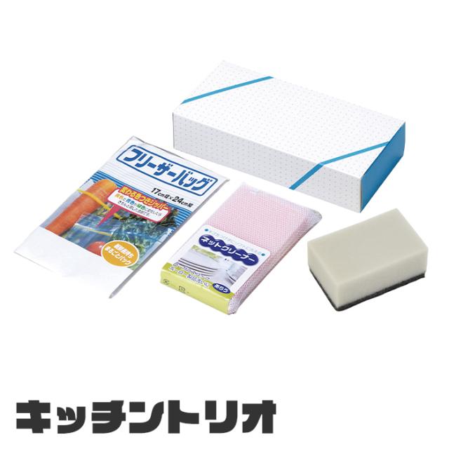 キーワード: キッチンギフトセット フリーザーバッグ ネットクリーナー 抗菌スポンジ キッチン 消耗品 セット キッチントリオ キッチン消耗品 ギフト イベント 景品 ノベルティ 行事 くじ ガラポン 挨拶 引っ越し キッチントリオ