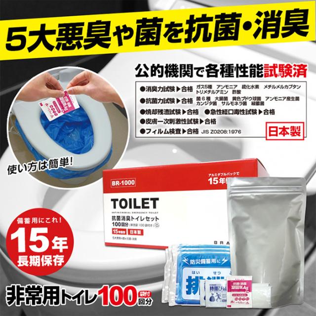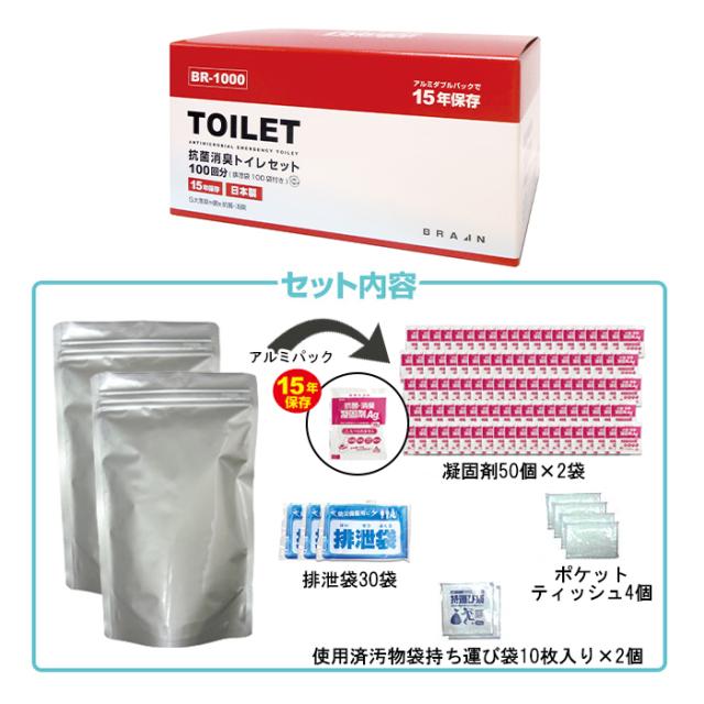 キーワード: 非常用トイレ トイレセット 抗菌消臭トイレセット 100回分 100回用 非常トイレ 簡易トイレ 汚物 排泄物 凝固 水不要 消臭 抗菌 凝固剤 汚物袋 ポケットティッシュ 持ち運び袋 アルミパック 長期保存 備蓄 非常時 避難 災害 震災 水害 万が一の備え 渋滞 レジャー キャンプ アウトドア 抗菌非常用トイレ 汚物袋付 業務用100回分 Wアルミパック