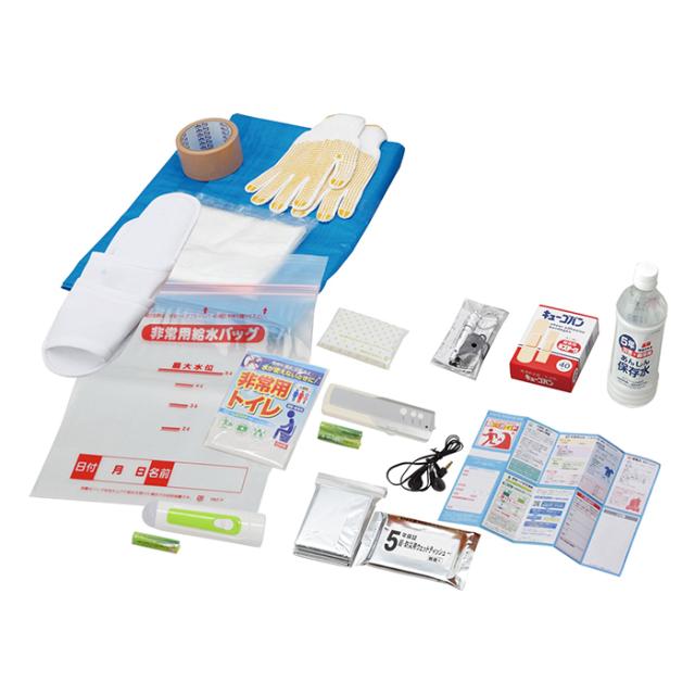 | ●リュック ●コンパクトFMラジオ ●単4マンガン電池×2本 ● 2WAYぴかりんライト ●単3マンガン電池×1本 ●保存水500ml ●ブルーシート2畳用 ●非常用給水バッグ5L ●防災用ウエットティッシュ ●防寒シート ●ホイッスル ●すべり止め手袋 ●非常用トイレ ●ポケットティッシュ ●ゴミ袋45L (10枚)半透明 ●スリッパ ●布テープ ●救急絆創膏 2サイズ40枚入 ●防災ガイド |