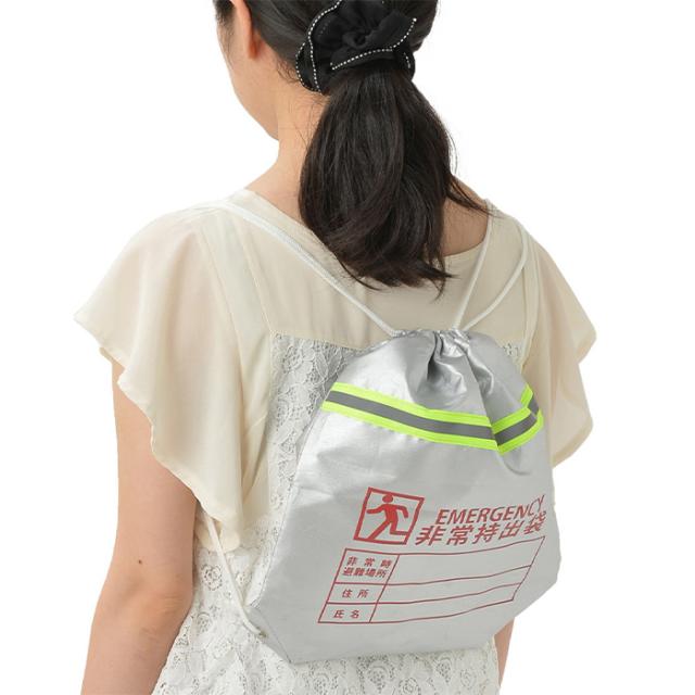 | 反射テープ付き 非常持出袋 ナップサック 担ぐ バッグ 手が空く 巾着 袋 持ち出し 非常時 避難 名前 氏名 住所 避難場所 記入 災害 震災 水害 万が一の備え 反射テープ付携帯用非常持出袋 |