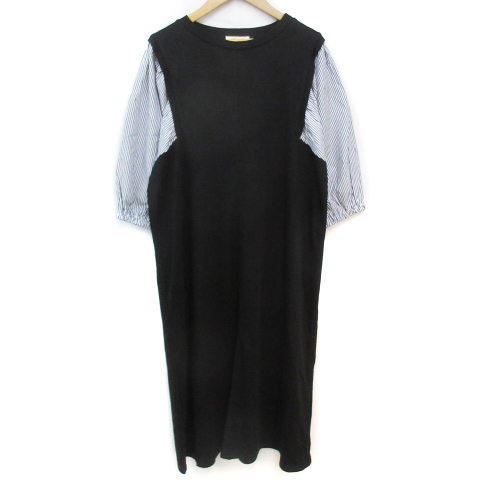 【中古】未使用品 クラシカルエルフ ワンピース ロング丈 七分袖 ラウンドネック ストライプ柄 L 黒 白 レディース