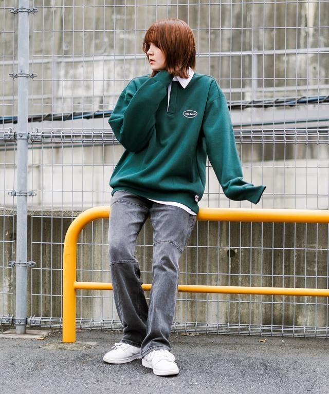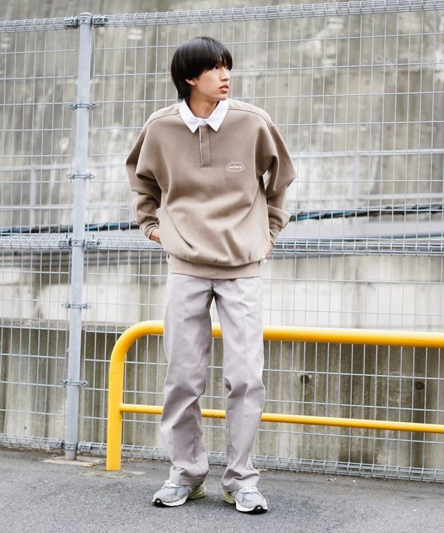 ヘビー裏起毛の衿付きスウェット。アイスクリーム店のスタッフさんが着ていそうなデザイン。左胸は刺?、背面はプリントです。