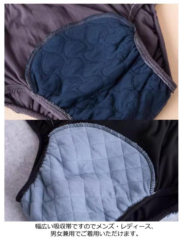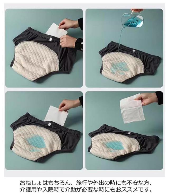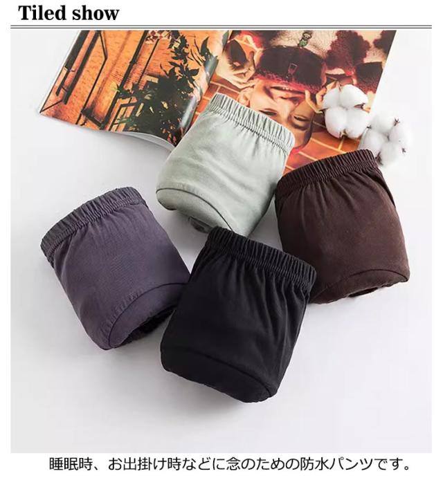 | 柔らかく肌に気持ちのいいちょい漏れ防止パンツ。 睡眠時、お出掛け時などに念のための防水パンツです。 おねしょはもちろん、旅行や外出の時にも不安な方、介護用や入院時で介助が必要な時にもおススメです。 ウエストゴムは、締め付け感を軽減しています!伸縮性がありサラサラの肌触りなので、お肌に優しい素材を採用。 男女兼用! Lから3XLまでの大きいサイズご用意しています。 幅広い吸収帯ですのでメンズ・レディース、男女兼用でご着用いただけます。 | |