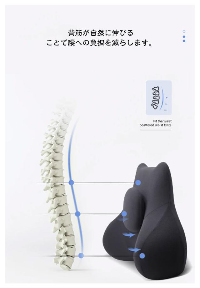 | 【商品名】腰当てクッション 【サイズ】サイズ表 【素材】中材:低反発メモリーフォーム 【特徴】 人間工学に基づいた設計された腰クッション。 頭から腰にかけてのS字カーブをしっかり支えます。 背筋が自然に伸びることで腰への負担を減らします。 低反発メモリーフォーム素材を採用。柔らかすぎず硬すぎない適度な反発力で体圧を分散することで長時間座っていても快適です。 日々のオフィスワークや長距離運転などが多い方、テレワークの方など快適に座りたい方にオススメです。 ミニクッション付き★突起部分が背中や腰に心地よい刺激を与えてくれます。 | |