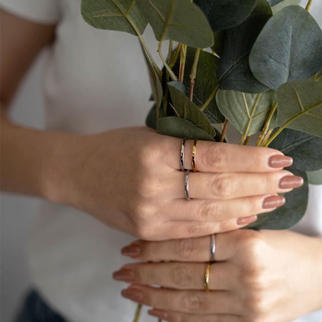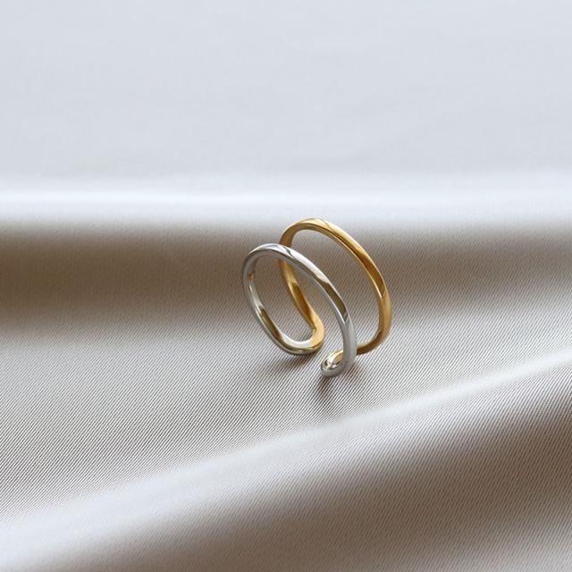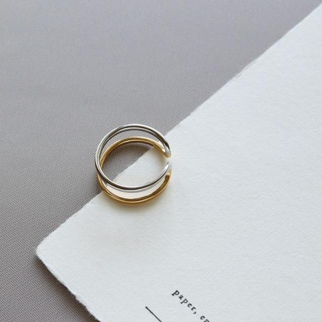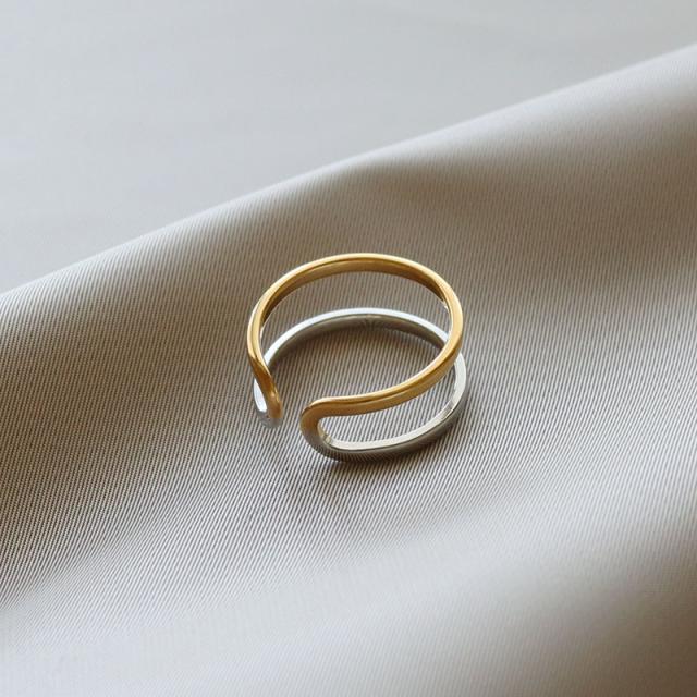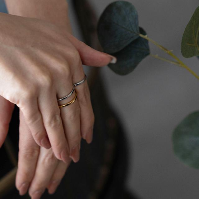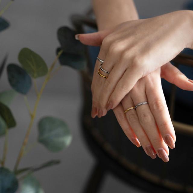 | 水にも強く、金属アレルギーの方でも比較的安心して使えるお肌に優しいサージカルステンレス製のリングです。 着ける向きを変えれば違う表情が楽しめるゴールドとシルバーの2色使いで合わせた2連風デザイン。 抜け感のあるシルエットで指をスマートに見せてくれます。 | |