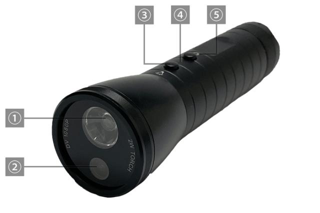 ①LEDライト ②カメラレンズ ③LEDライトON/OFFボタン ④動作ランプ ⑤電源ON/OFF・撮影ボタン