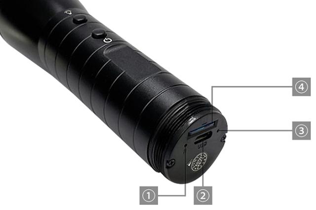 ①リセット ②microUSB端子 ③充電ランプ・内蔵マイク ④microSDカード挿入口