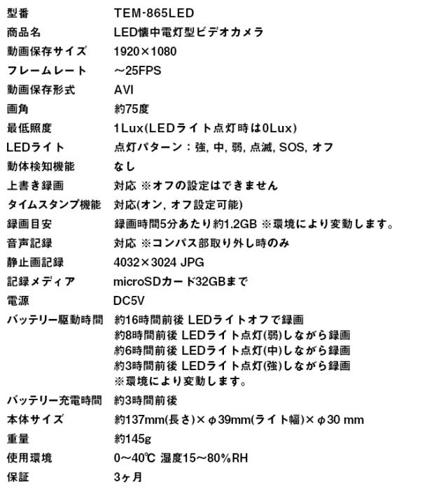 『TEM-865LED』 フルHD録画対応懐中電灯擬装(偽装)小型カメラ