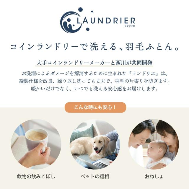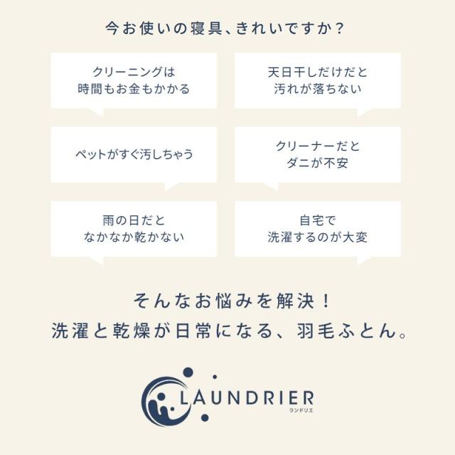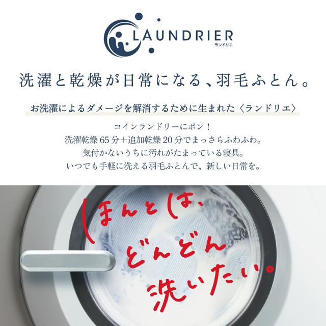 コインランドリーで洗える羽毛布団【ランドリエ】汚れても安心。コインランドリーでいつでも洗って乾燥までOK! 繰り返し洗っても、ふんわり感と暖かさをキープ。