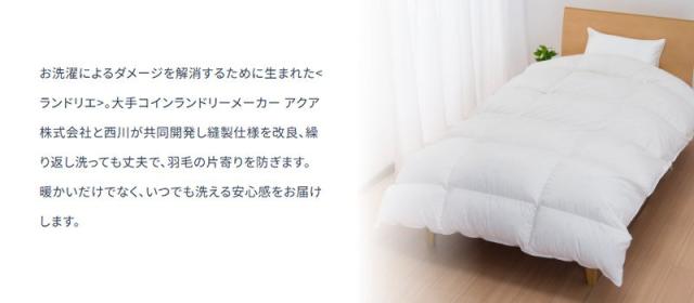 | ・コインランドリーで洗える羽毛布団 大手コインランドリー会社・アクア株式会社と西川株式会社が共同開発し縫製仕様を改良、繰り返し洗っても丈夫な羽毛布団。 | |